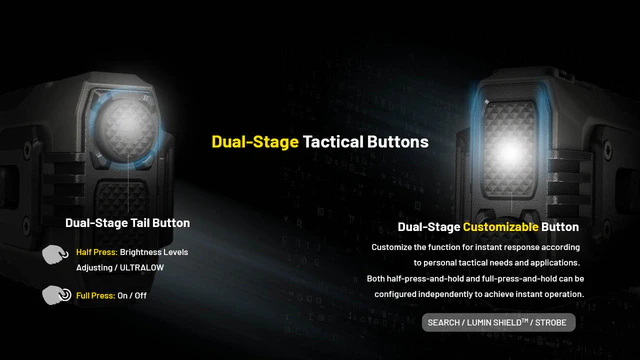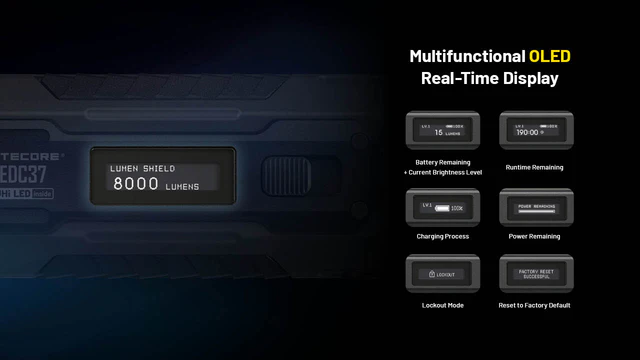 Designed for versatility, it offers four brightness levels, plus Spotlight, Floodlight, and Strobe modes. A digital OLED screen clearly displays the current brightness level, remaining battery life, and more. The EDC37 also features two dual-stage tactical buttons: a circular tail button for adjusting brightness and accessing the momentary ultralow mode, and a rectangular customizable button that can be set to activate Spotlight, Floodlight, or Strobe.