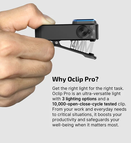 • 5-in-1 Lighting System: With up to 600 lm white light, UV, RGB (R/G/B), and multiple flashing modes, Oclip Pro S delivers one compact lighting solution for home, hands-on tasks, and light outdoor use.