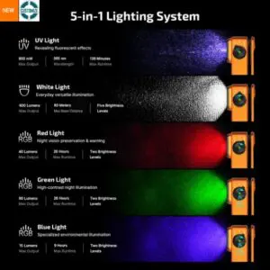 • RGB Lighting: Red, green, and blue lights support night use, location marking, visual identification, and expressive lighting, with both steady and flashing modes for flexible application.