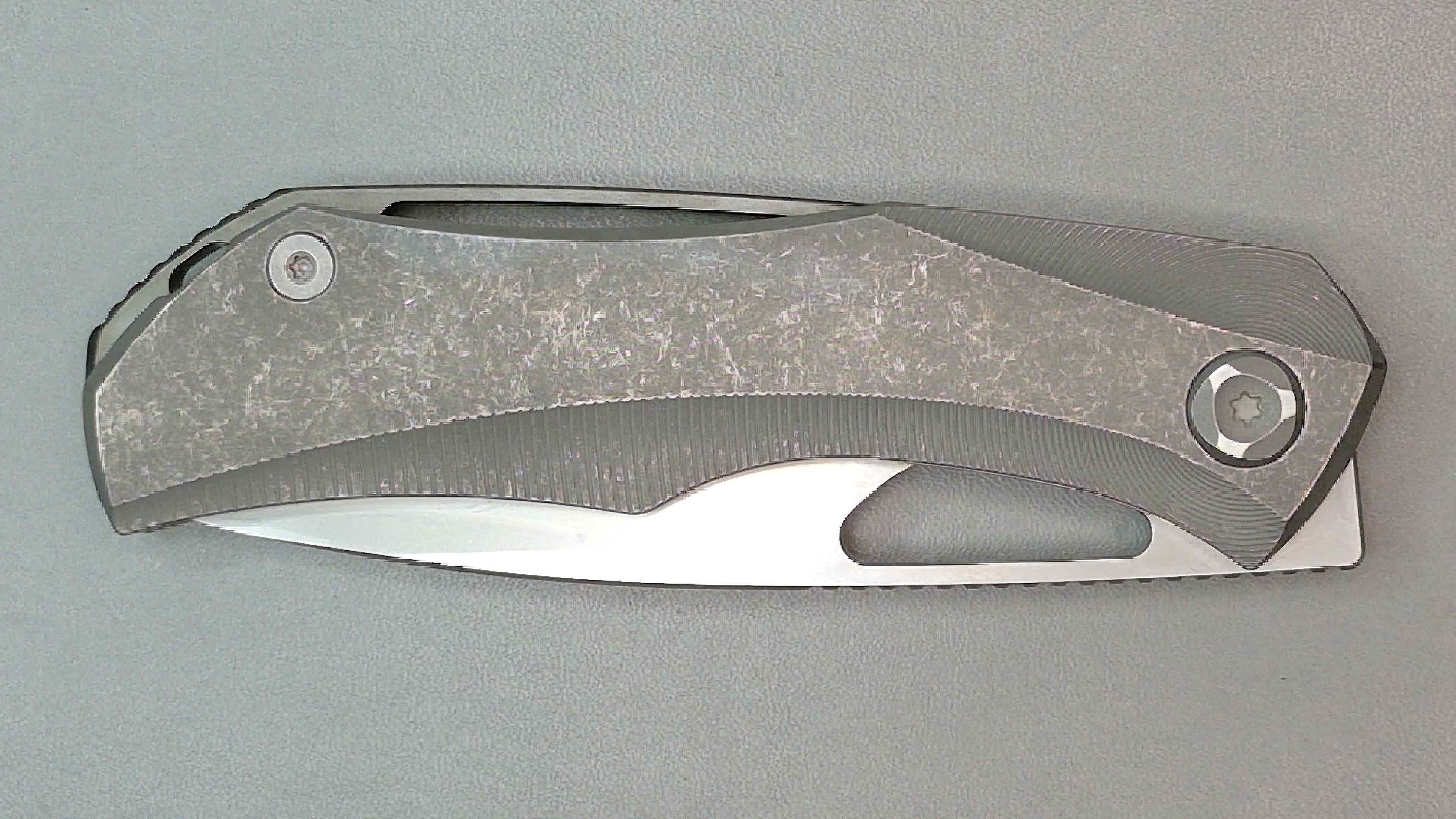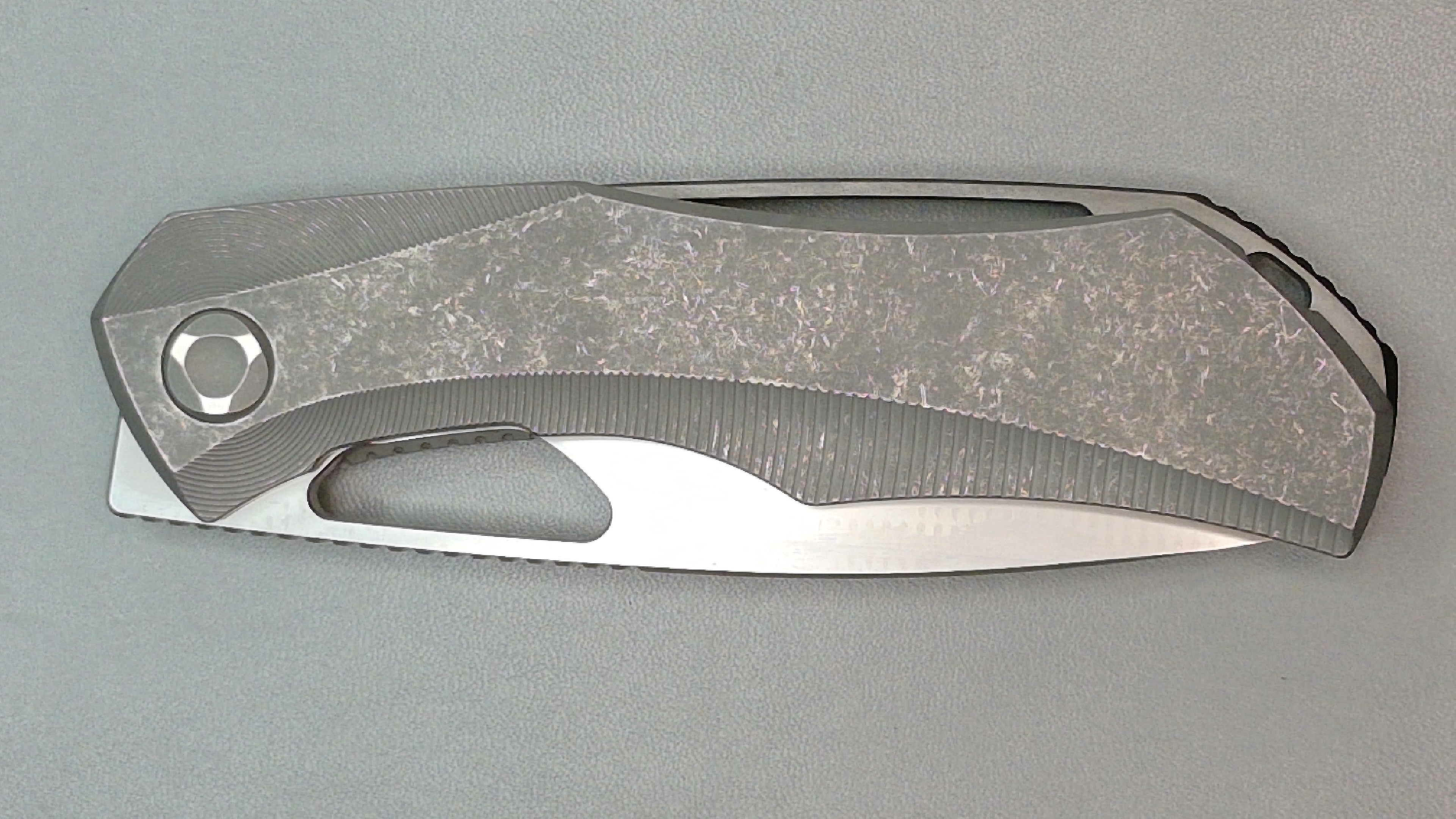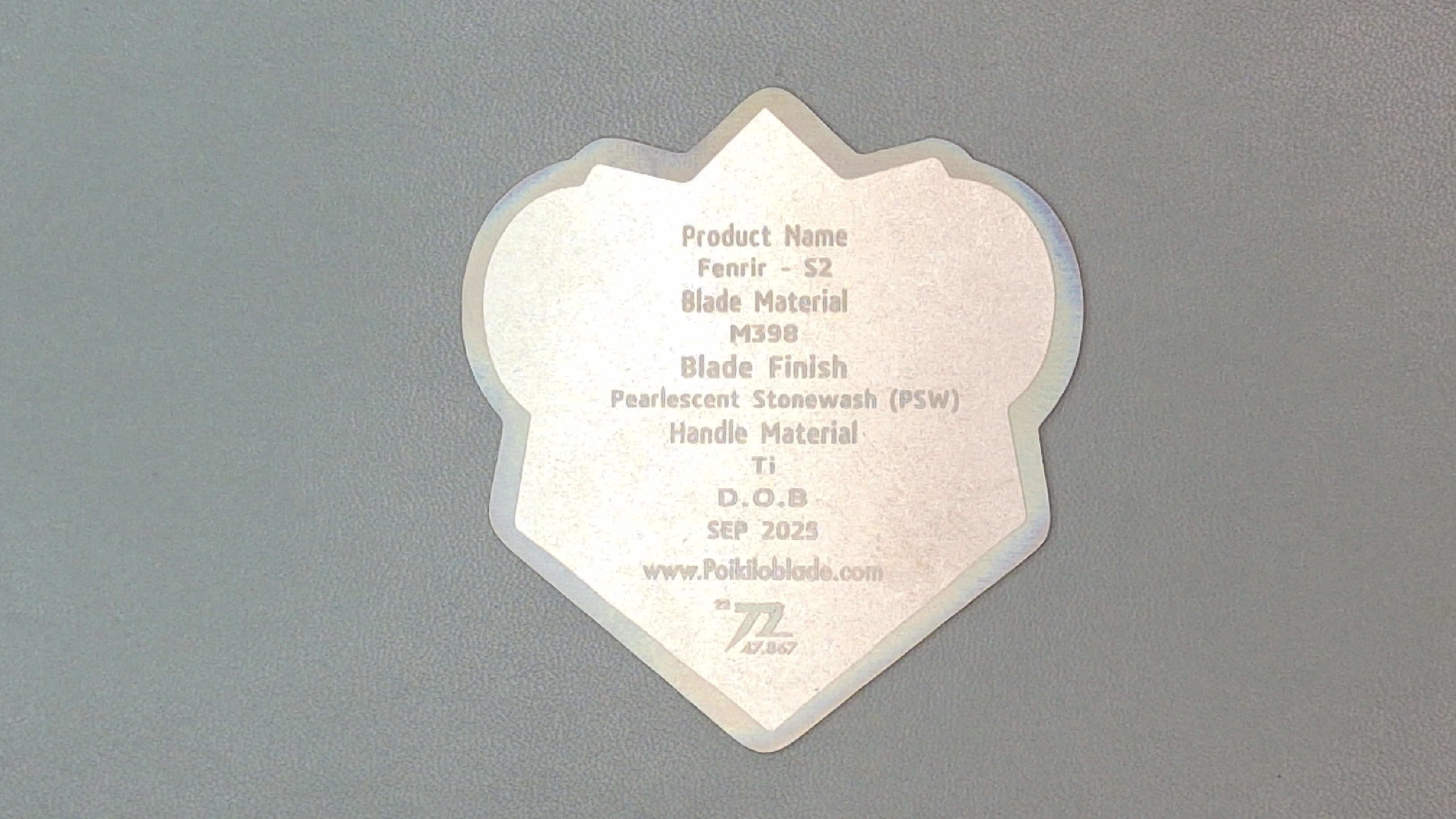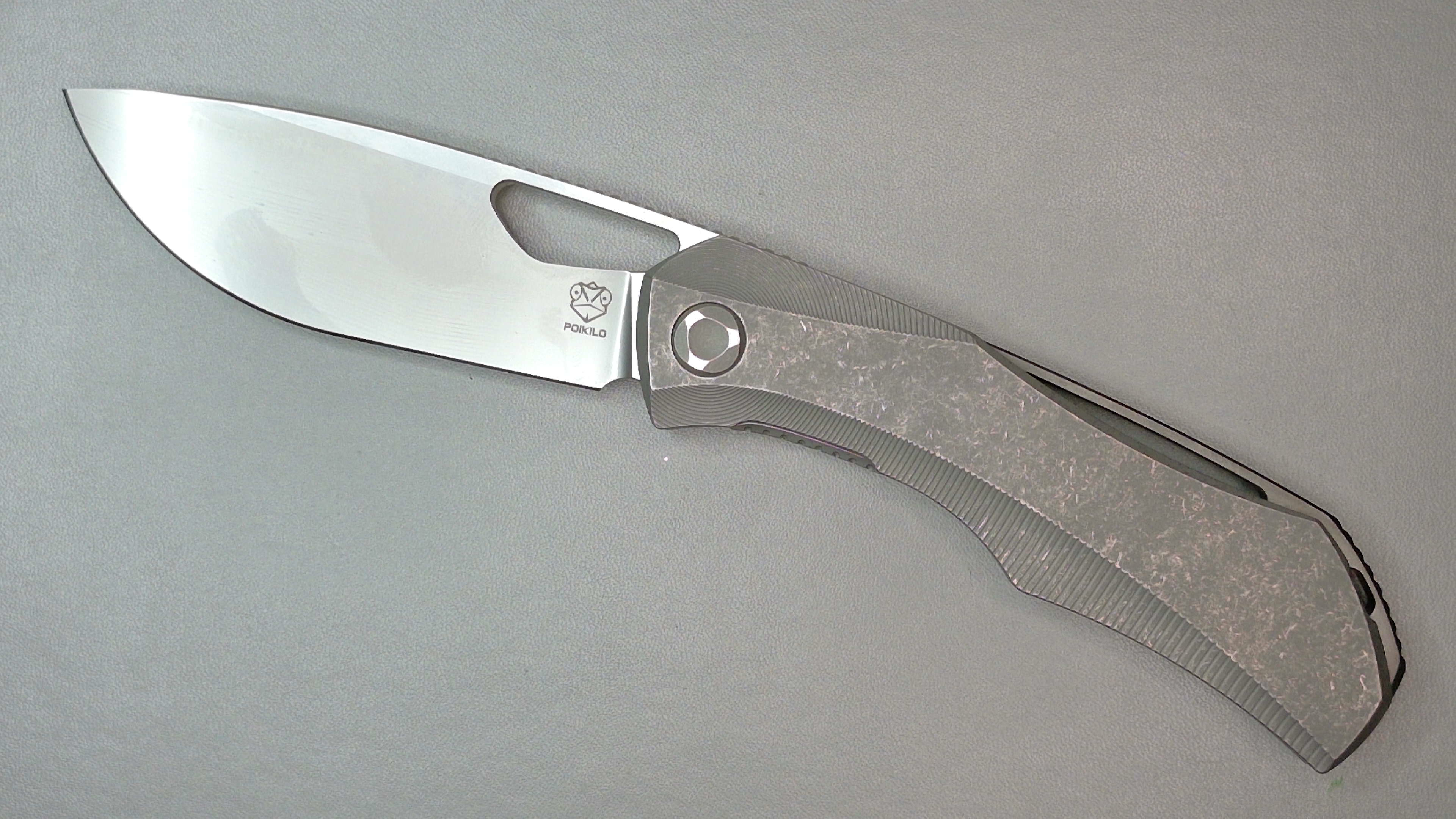 Poikilo Blade Fenrir S2 Dark Stonewash Titanium Handle M398 Drop Point Plain Edge Pearlescent Stonewash