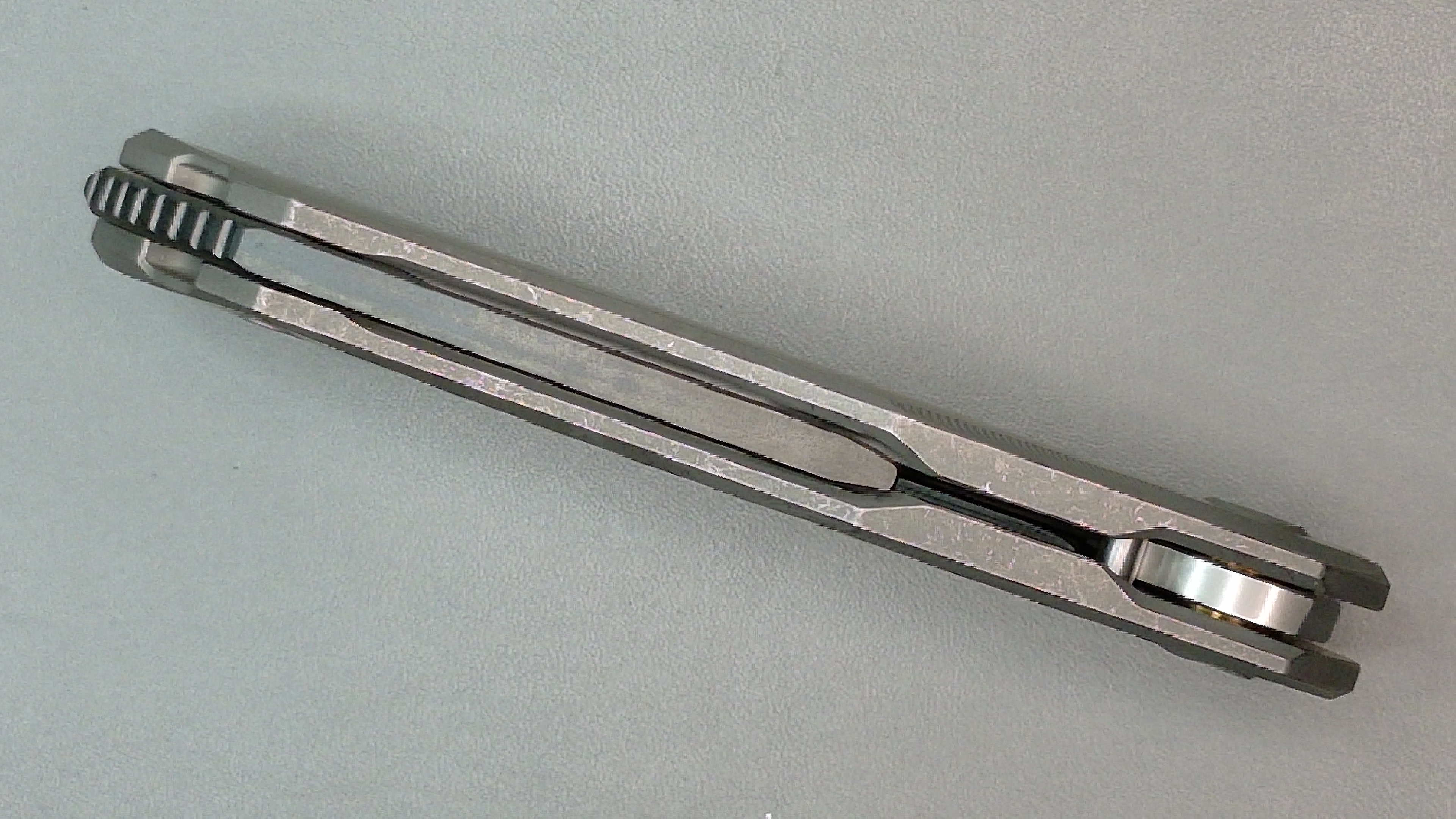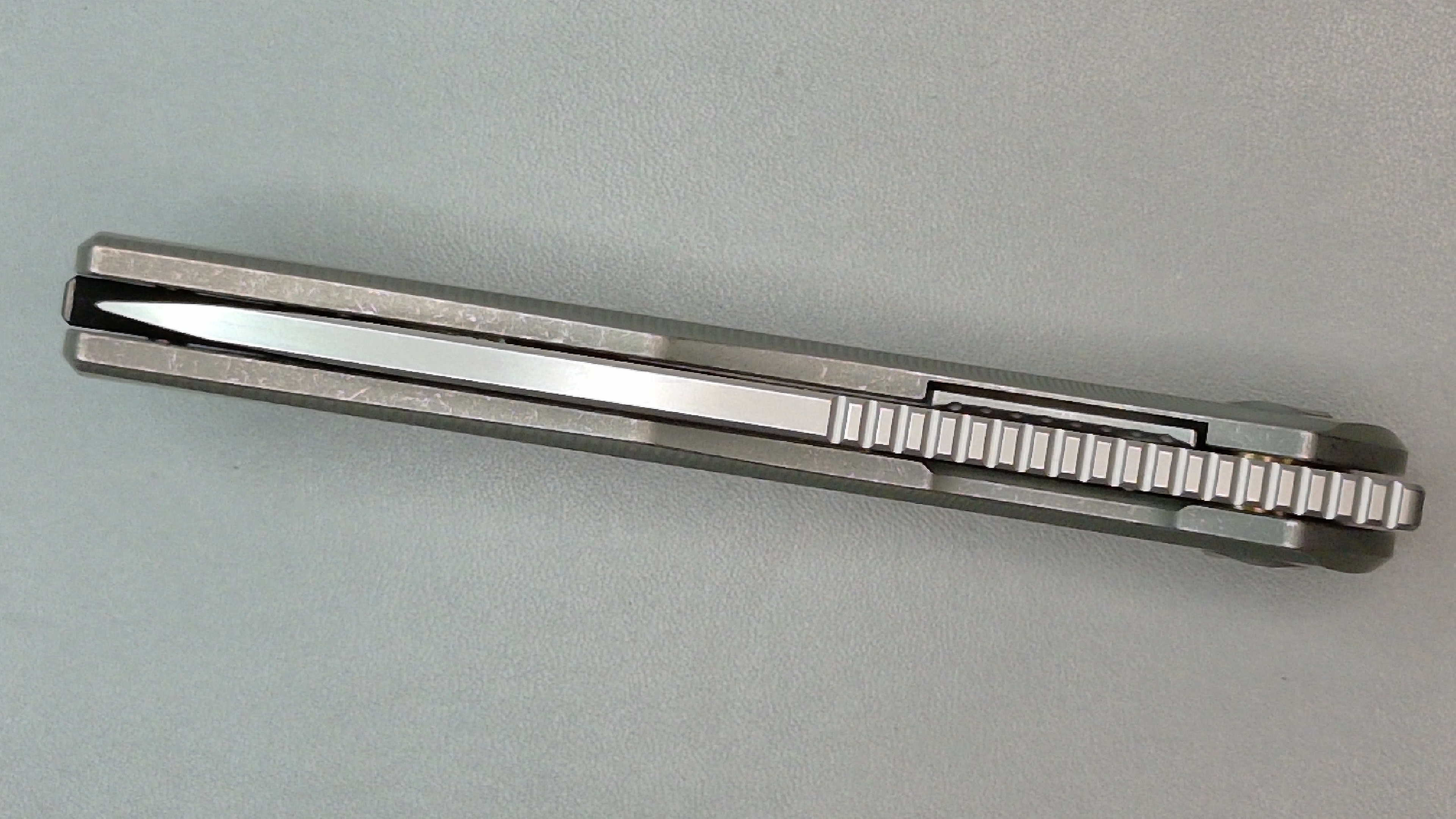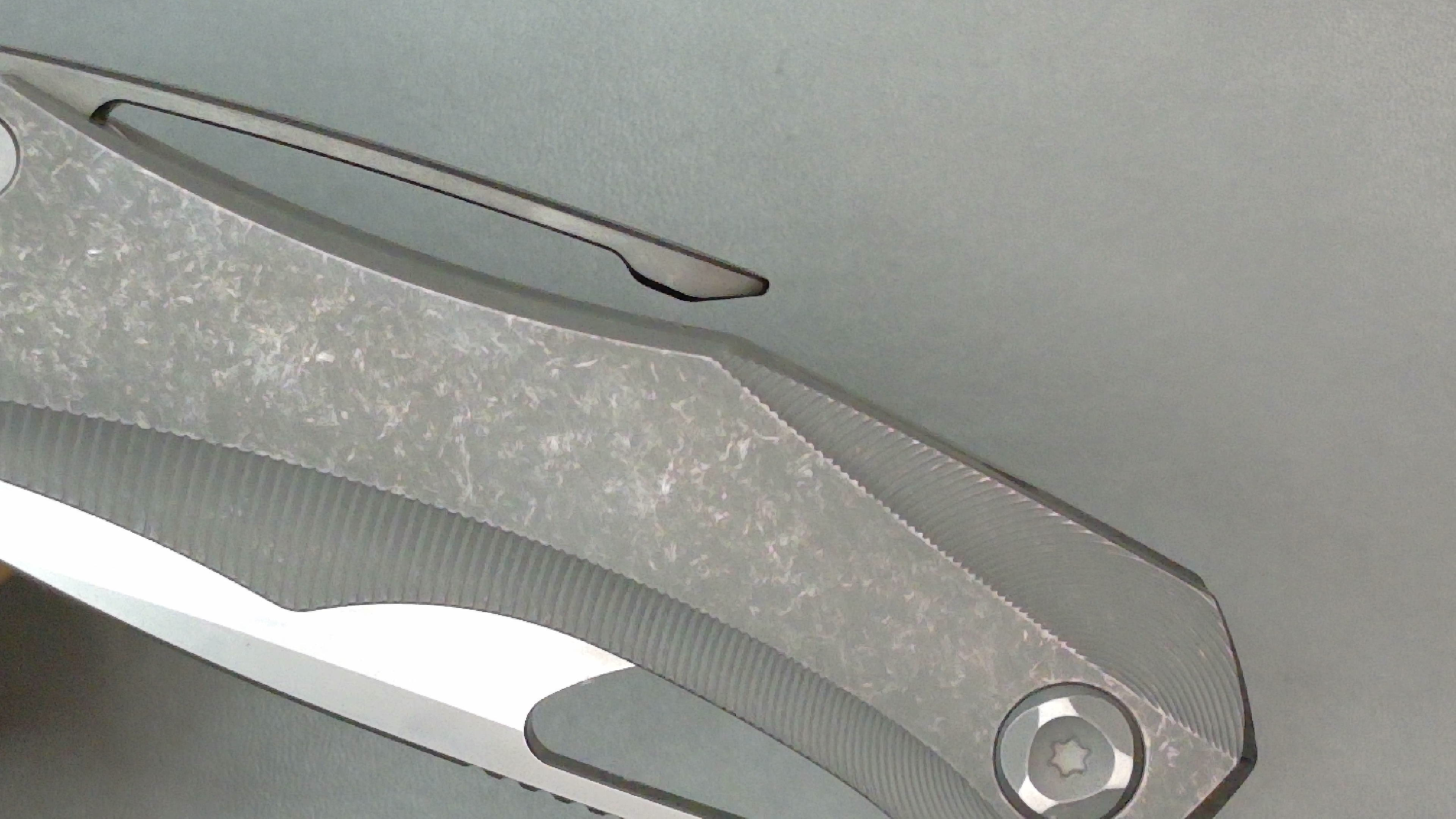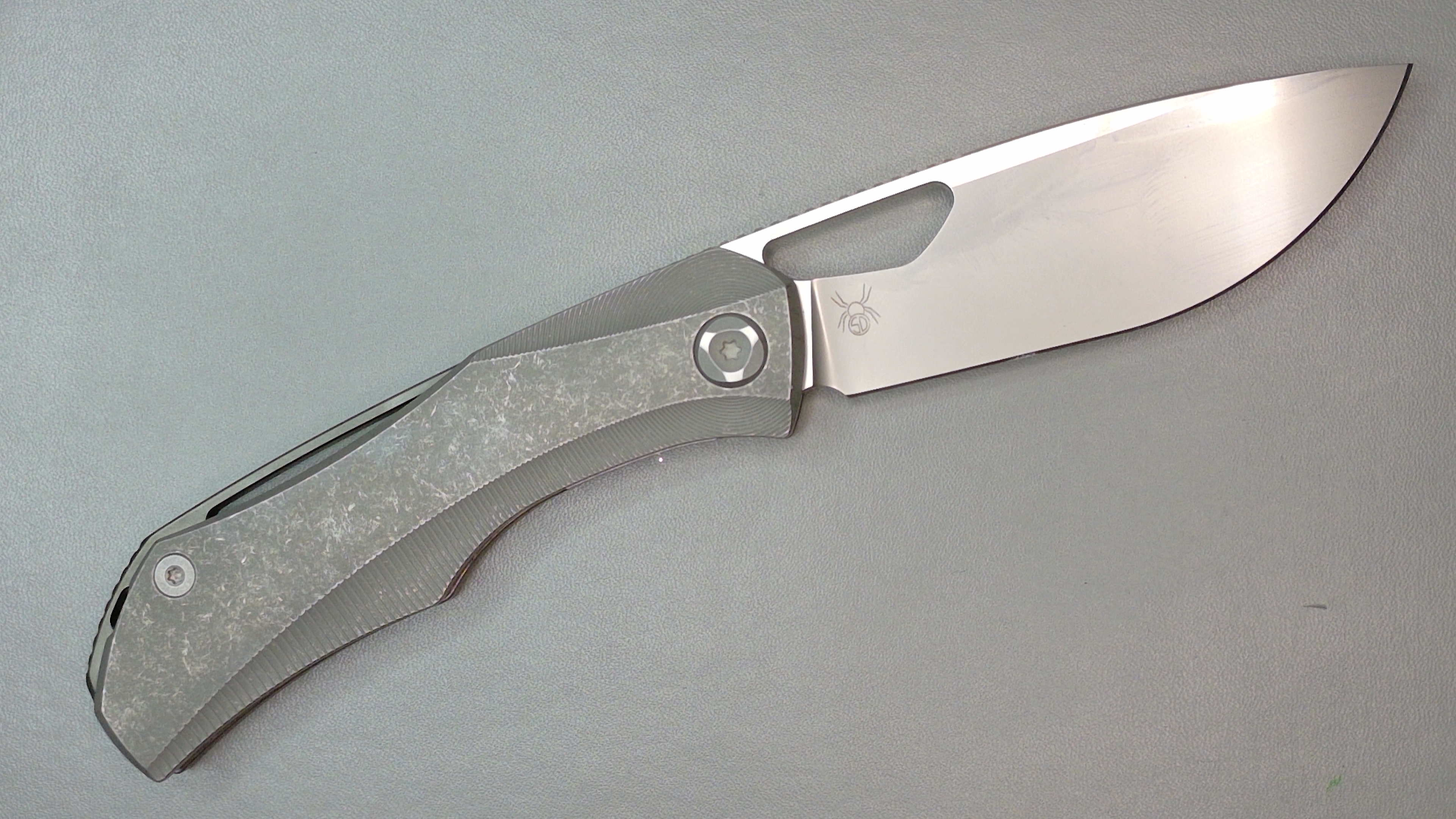 Poikilo Blade Fenrir S2 Dark Stonewash Titanium Handle M398 Drop Point Plain Edge Pearlescent Stonewash