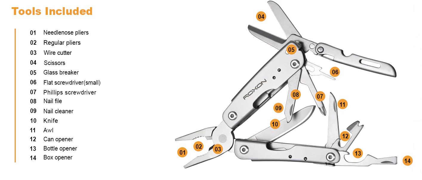 - 14 built-in tools including pliers, cutting tool, openers, screwdrivers, and glass breaker